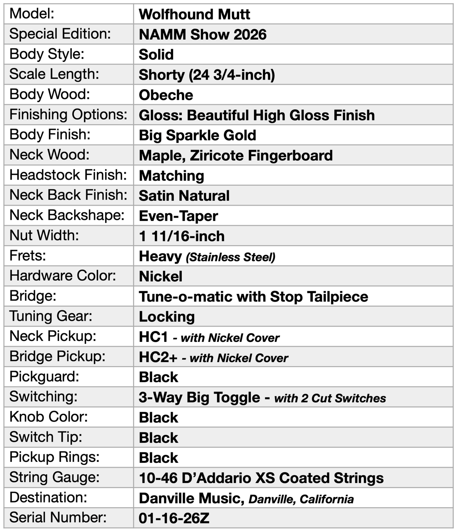 Wolfhound Mutt expands the band…width of traditional sounds with its optional (other than mahogany) wood choices. This one boasts a Maple neck, Ziricote Fingerboard, and Obeche (Oh-beach-ee) body. Obeche is the body wood that the masterful Tim Pearce described as “creamy” sounding, and we wholeheartedly agree. Could not have said it better ourselves. Smooth and flowing sound with a soft top end and ultra musical presentation.