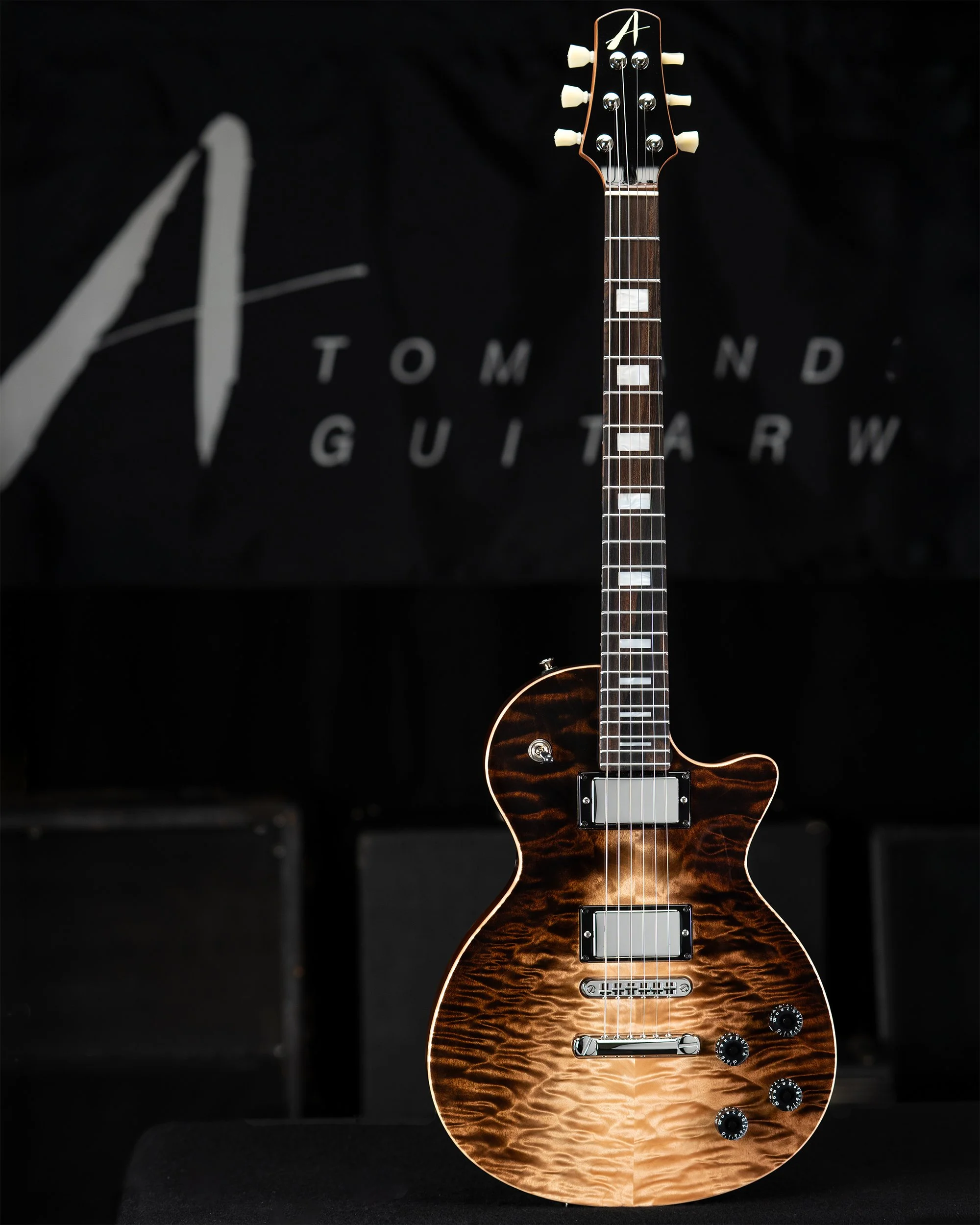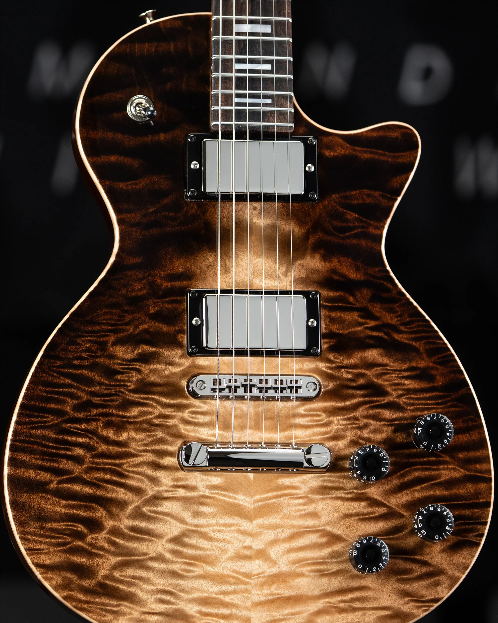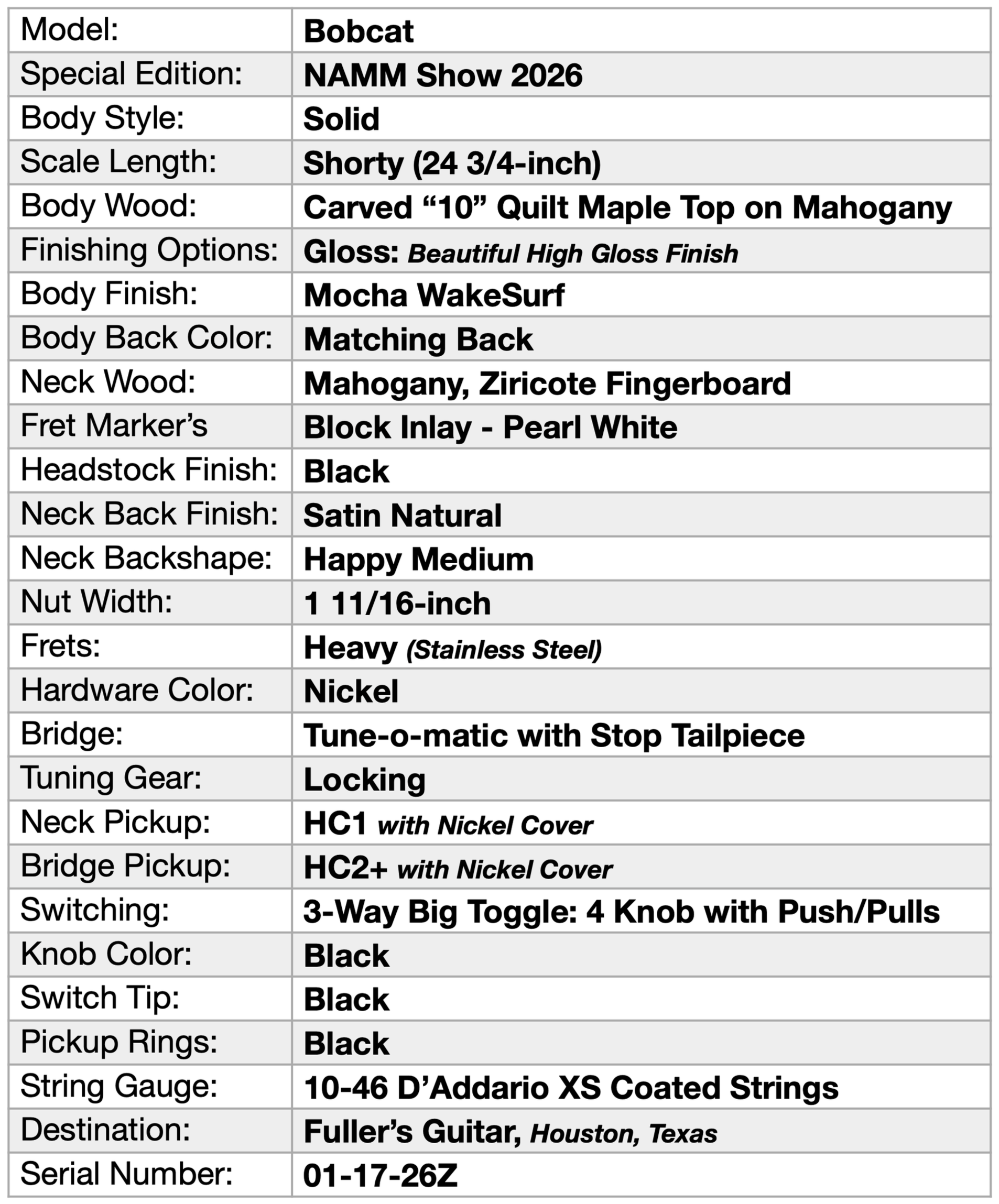 Bob usually appears on stage dressed in a Carved Maple Flame Top. So to see this Bobcat with a crushingly beautiful Carved "10" Quilt Maple Top for NAMM 26 is a rare and wonderful thing to behold indeed. Kind of like finding a Bobcat in your house in the first place — first thing in the morning — finished in Mocha Wakeup Surf. I mean finished in: Mocha WakeSurf.