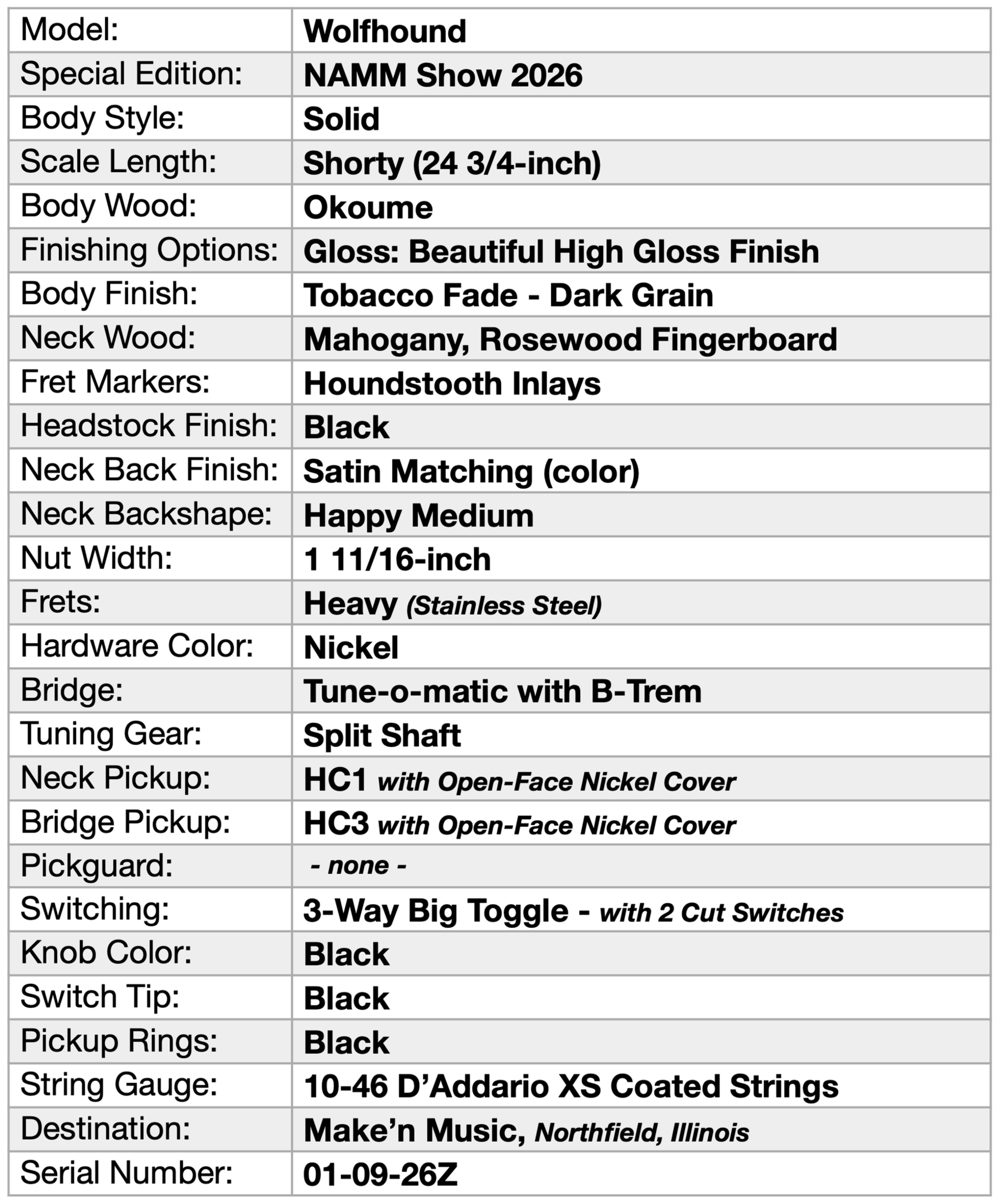 One of three to be at the show, this 3rd Wolfhound took the NAMM stage dressed out in Tobacco Fade - Dark Grain—which is a transparent yellow over its Okoume body (dominant mid-focus mahogany + tone) transitioning to a transparent light brown edge giving it a shaded, optically satisfying earth tone look. A perennial favorite among wonderful guitar colors.