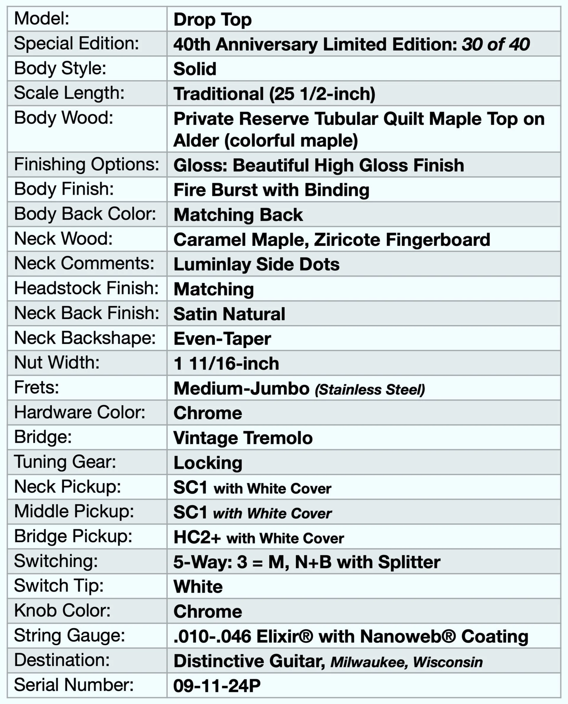 This then is the 2nd, and the final (frontier), Fire Burst, Drop Top from the 40th Anniversary, Limited Edition collection of fantastically fine instruments.