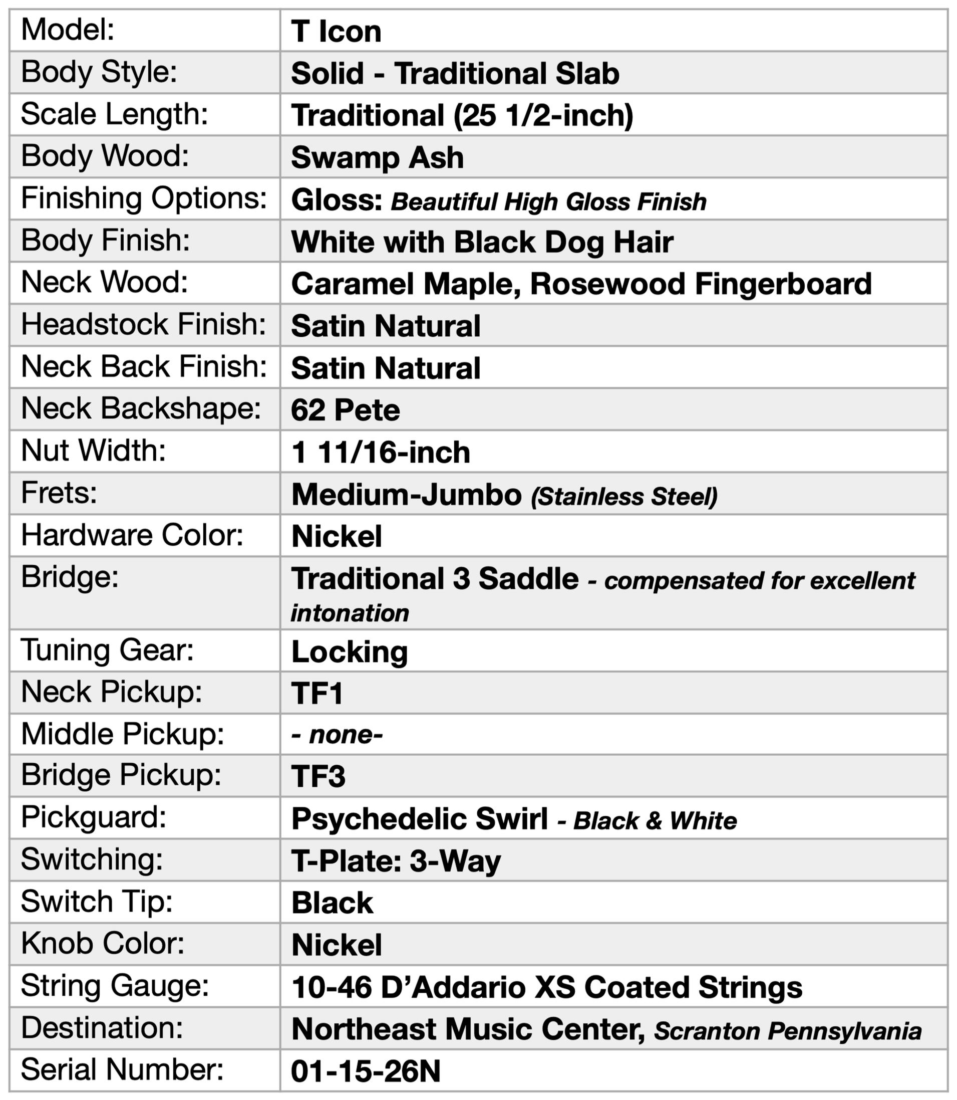 The dynamic nature of the Dog Hair paint process is joyfully undeniable. This White with Black Dog Hair is finished with a glossy top coat, shiningly showcasing the Swamp Ash body wood below.