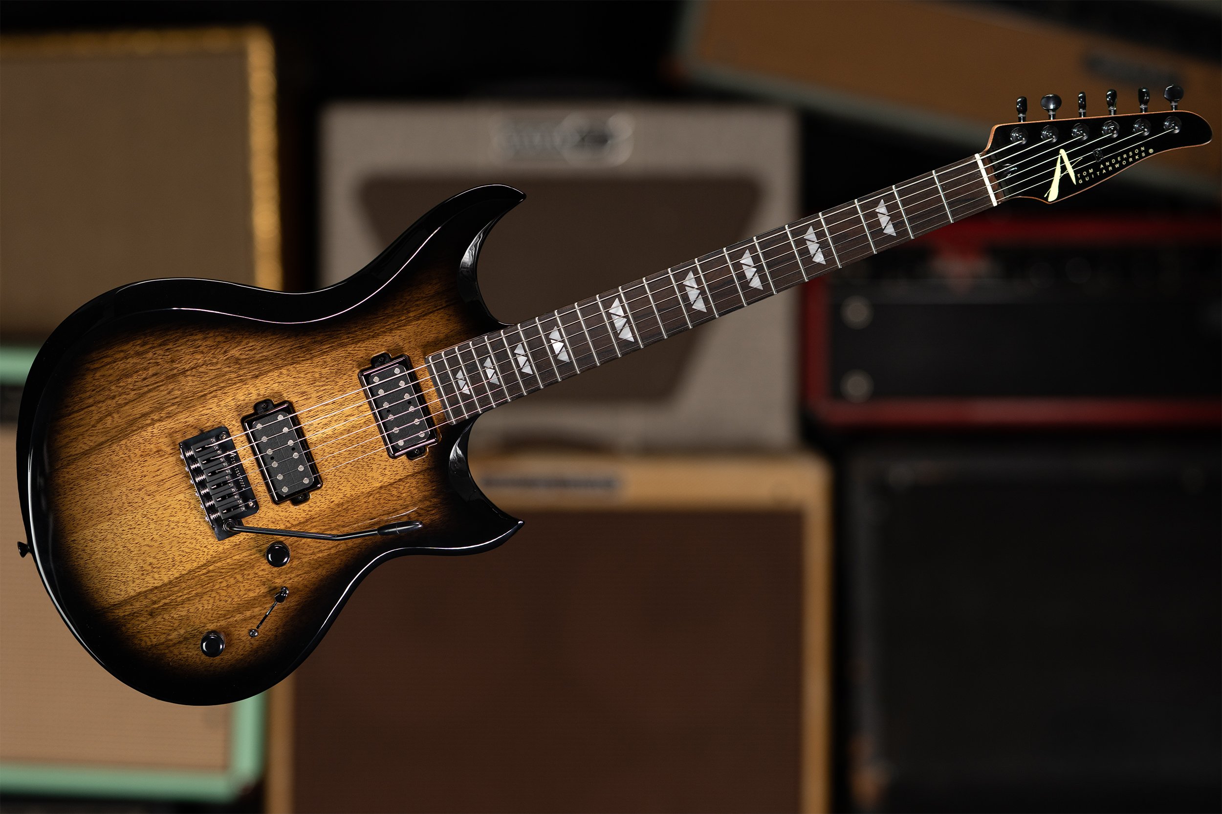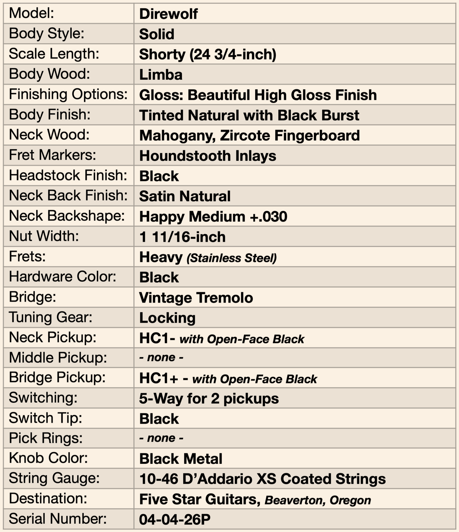 This profound first production DireWolf features a Limba body finished in Tinted Natural to Black Burst and is headed to Five Star Guitars in Beaverton, Oregon.