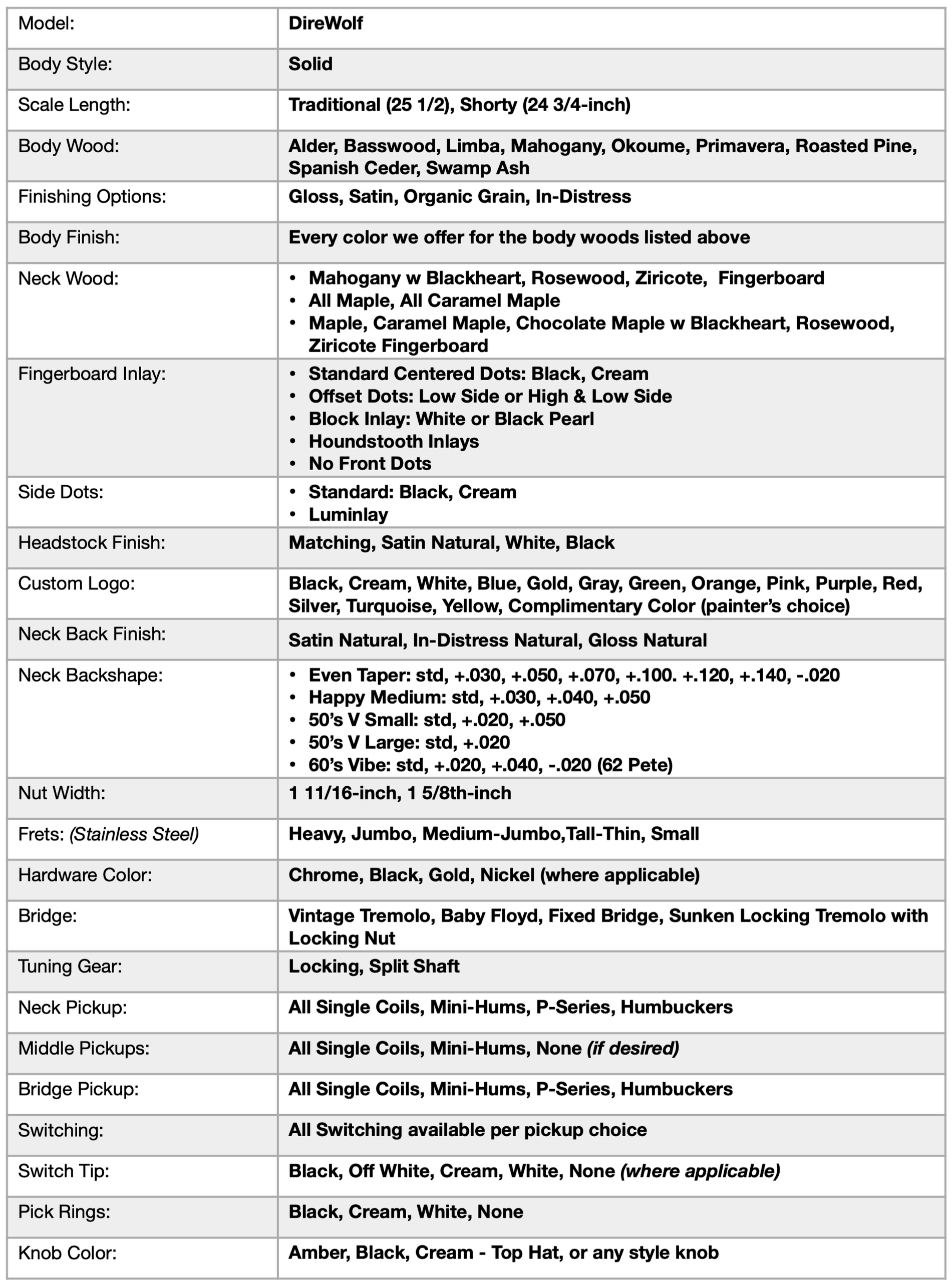 But is DireWolf actually physically bigger or is that mere musical folklore — a metaphor to exemplify its profound, multifaceted playing prowess? Well, mostly a metaphor because the DireWolf’s silhouette and sizing remain the same, but…DireWolf breaks out with archetypical Anderson body thickness — 25% thicker — like all of our other guitars except Wolfhound. This normalized aspect changes everything, granting a universe of universal access to a plethora of loved and versatile Anderson appointments — for those who want a much more all-embracing form factor with the alluring “Wolf” styling. A brand-new guitar that certainly will not go unnoticed.