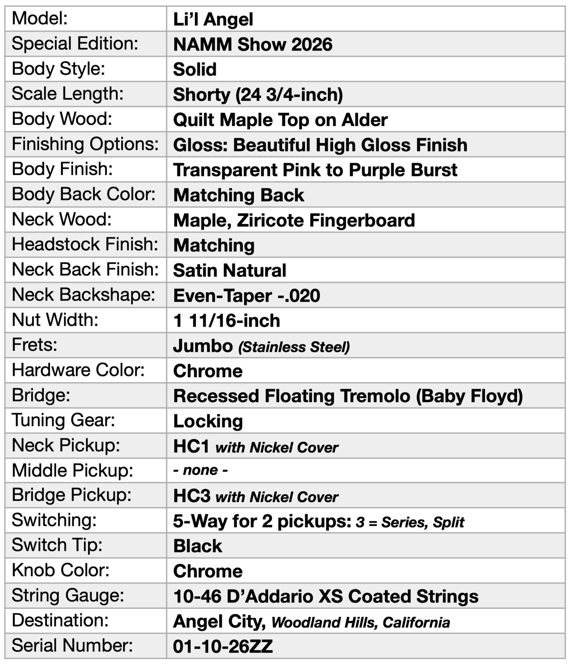 And we also know when you hold your guitar and gaze up at the majestic night sky, you are wondering why does this Li’l Angel also appear as Transparent Pink to Purple Burst. Well, the answer is far more complex. It is because…we paint it that way—just like the universe. Equally natural and equally beautiful. The Quilted Maple Top makes it look like forming nebula clouds.