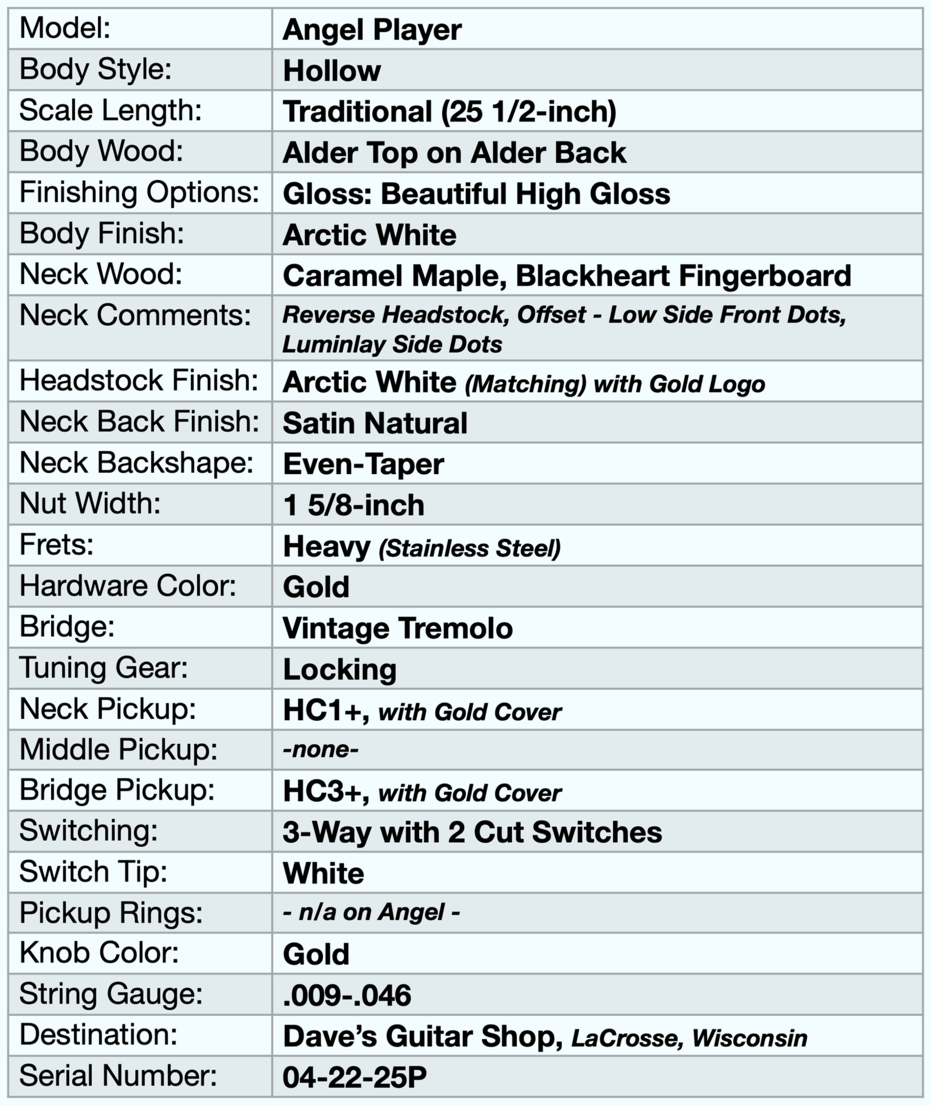 Oh yes…an Angel Player, this one completely decked in a resplendent glossy Arctic White finish shining under the lights and enlivened by a full complement of Gold Hardware and Pickup Covers. One of those wonderful, time-honored looks that makes guitar players swoon. Lately, this “White Beauty” color scheme, along with its “Black Beauty” counterpart (black and gold), has been highly sought after, once again. So cool. Certainly understandable.