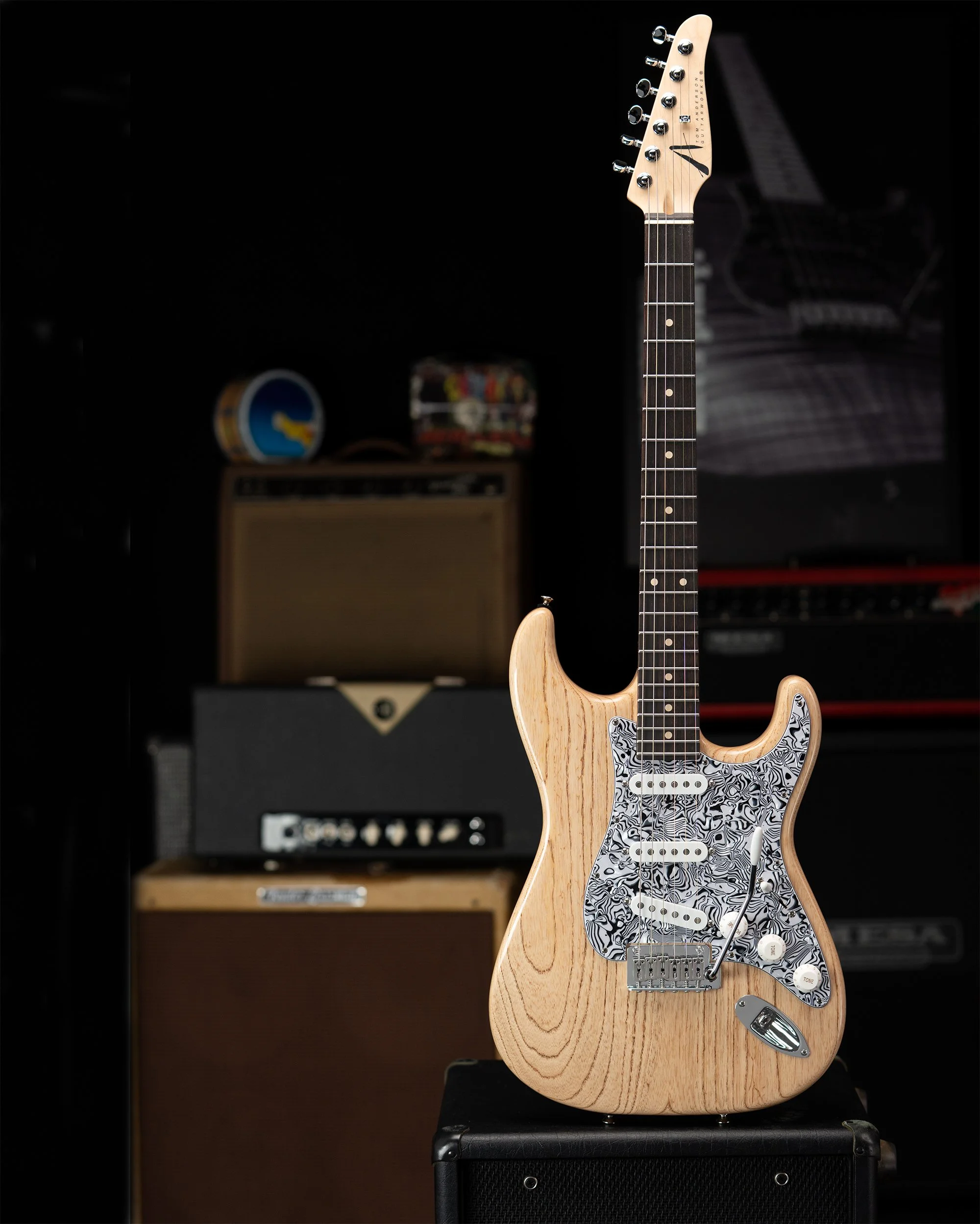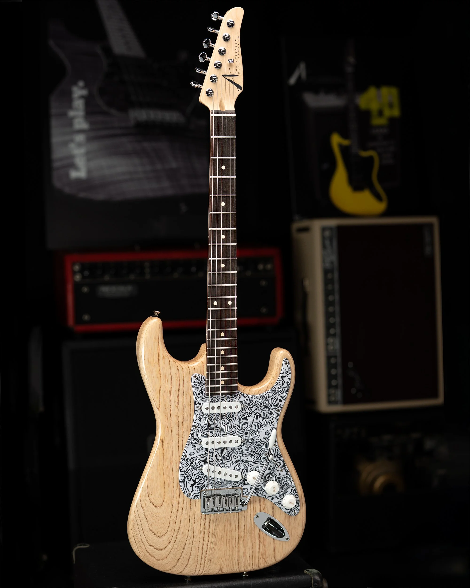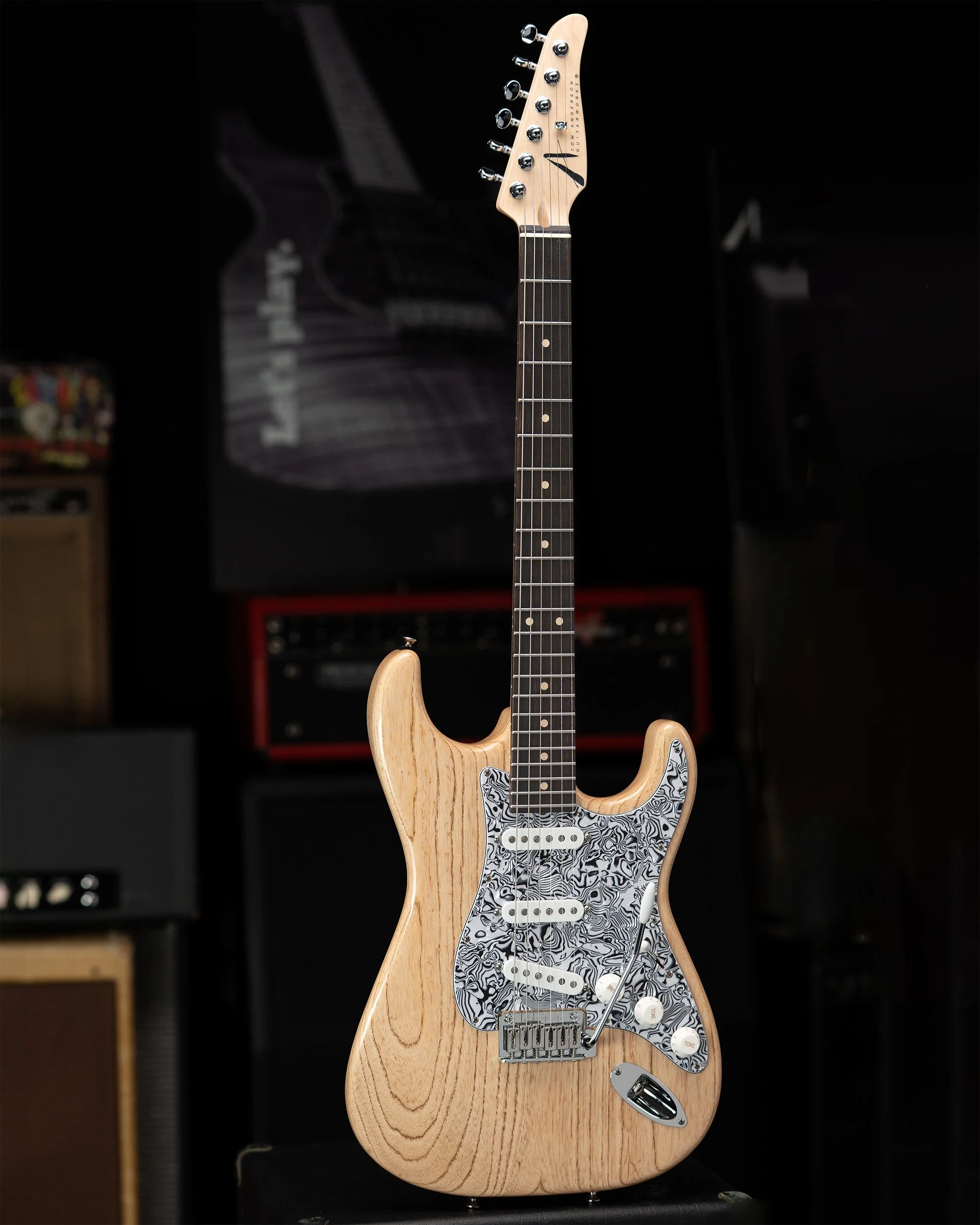 A Natural Dark Grain finish accentuates the beautiful, identifying swirls and curls of its Swamp Ash body, brought to an entirely other Earthly dimension when paired with a Psychedelic Swirl Pickguard.